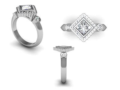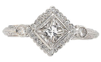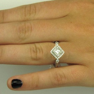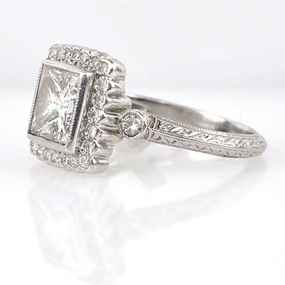 The original design we mutually appreciated most appears to the right, and is best described as a 1920s/30s art replica engagement ring, featuring a huge 1.76 carat center diamond, with a half carat filling out the rest to boot. The less-than-stellar certification of the diamond Rose threw off the boat at the end of Titanic triggered concern, and the fact that the ring could only be seen online prior to purchase made it a non-starter.